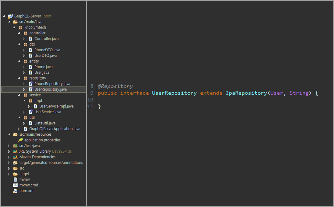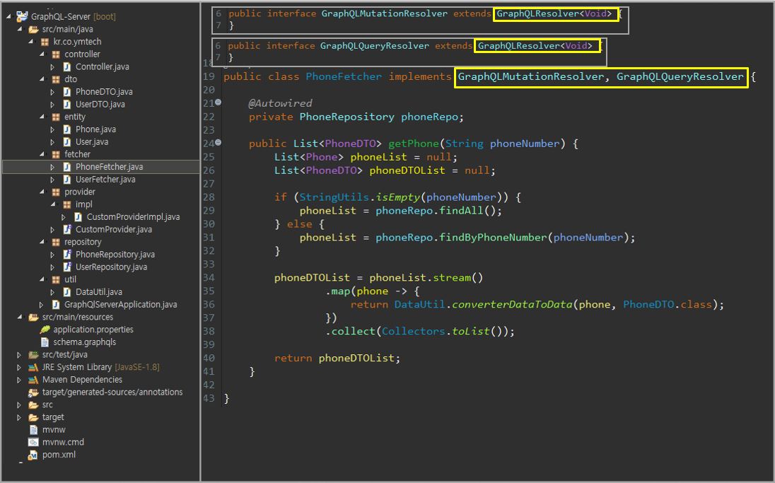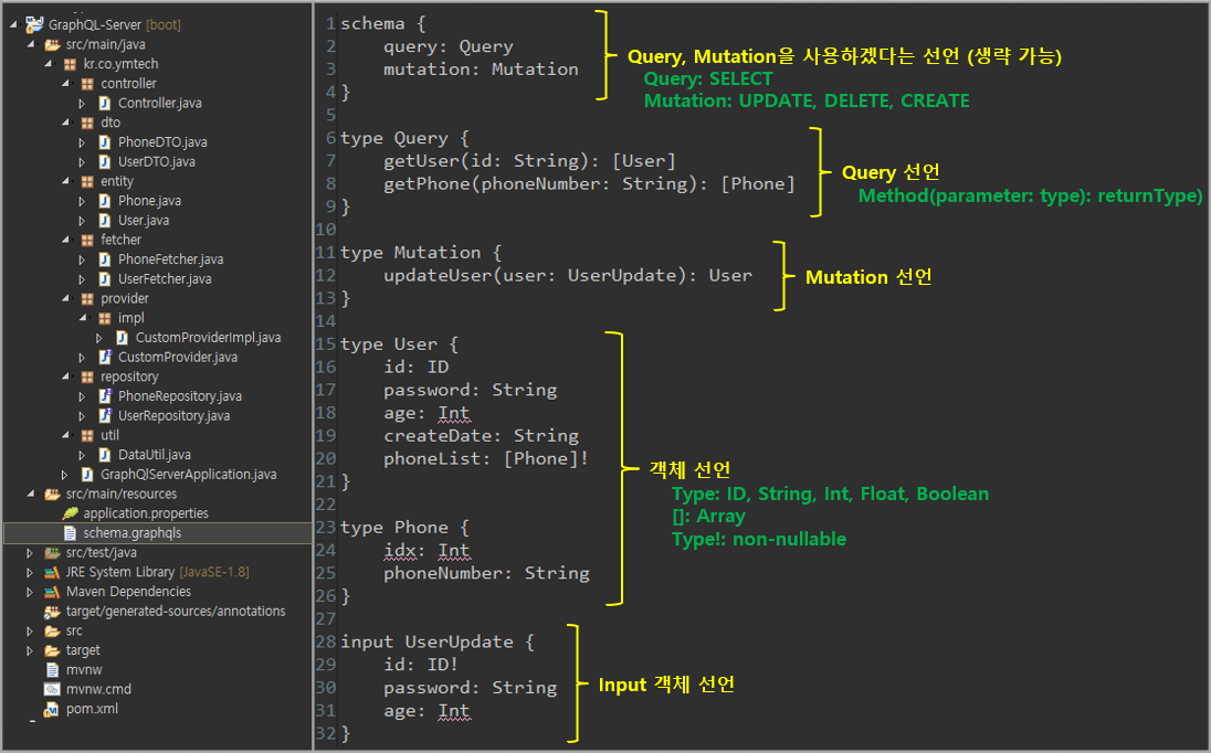 MutationResolver,QueryResolver의 차이는, 기능적인 차이는 없고 단순히 기능을 분리한기 위함이다. Mutation은 생성, 삭제, 수정 등의 CRUD에서 CUD의 기능을 정의하고,Query는 CRUD중 R의 기능을 정의한다.
